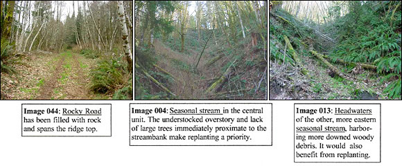 Enhancement and Protection Roads have been cleared with consciousness of erosion and care has been taken to minimize that possibility. Most roads are closed to vehicles during the wet season. Rocky Road, spanning the ridge on the south end of the property, has been filled with rock (Image 44). There is significant natural regeneration in roadcuts. Gates have been installed to keep cattle from entering the majority of the forested area. Western red cedar has been replanted in some areas. Septic systems do not effect the forested area. Woody debris in streams is most comprised of hardwoods, which will decay fairly rapidly. Management Recommendations I recommend that underplanting of Western red cedar be initiated in riparian zones if funding can be acquired through the SIP program. In areas where erosion is likely I recommend that roads remain closed. Culverts should be maintained and kept clear. The headwaters of the streams provide ample opportunities for restoration (Images 4, 13). Between habitat creation for small mammals and amphibians, soil stabilization through replanting, and regeneration of a native and diverse plant cover, the streams on the property could move from protected and mildly enhanced to central features of the forest. I recommend that restoration buffers be established formally or informally, and restoration efforts begin within these zones provided funding is obtained through the SIP program. |