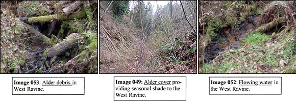 Enhancement and Protection Roads have been cleared with consciousness of erosion and care has been taken to minimize that possibility. Most roads are closed to vehicles during the wet season. Rocky Road, spanning the ridge on the south end of the property, has been filled with rock (Image 44). There is significant natural regeneration in roadcuts. Gates have been installed to keep cattle from entering the majority of the forested area. Western red cedar has been replanted in some areas. Septic systems do not effect the forested area. Woody debris in streams is most comprised of hardwoods, which will decay fairly rapidly. Management Recommendations I recommend that underplanting of Western red cedar be initiated in riparian zones if funding can be acquired through the SIP program. In areas where erosion is likely I recommend that roads remain closed. Culverts should be maintained and kept clear. The headwaters of the streams provide ample opportunities for restoration (Images 4, 13). Between habitat creation for small mammals and amphibians, soil stabilization through replanting, and regeneration of a native and diverse plant cover, the streams on the property could move from protected and mildly enhanced to central features of the forest. I recommend that restoration buffers be established formally or informally, and restoration efforts begin within these zones provided funding is obtained through the SIP program. |