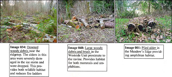 There is sufficient downed woody debris to provide amphibian and reptile habitat (Image 034). There are multiple brush piles across the property (Image 048). There are no talus slopes around which to retain a forested buffer, and rock piles would not be advised as there is no naturally occurring rock on the property. The pond creation practice is ongoing. The vegetation around streams and headwaters is being actively restored.